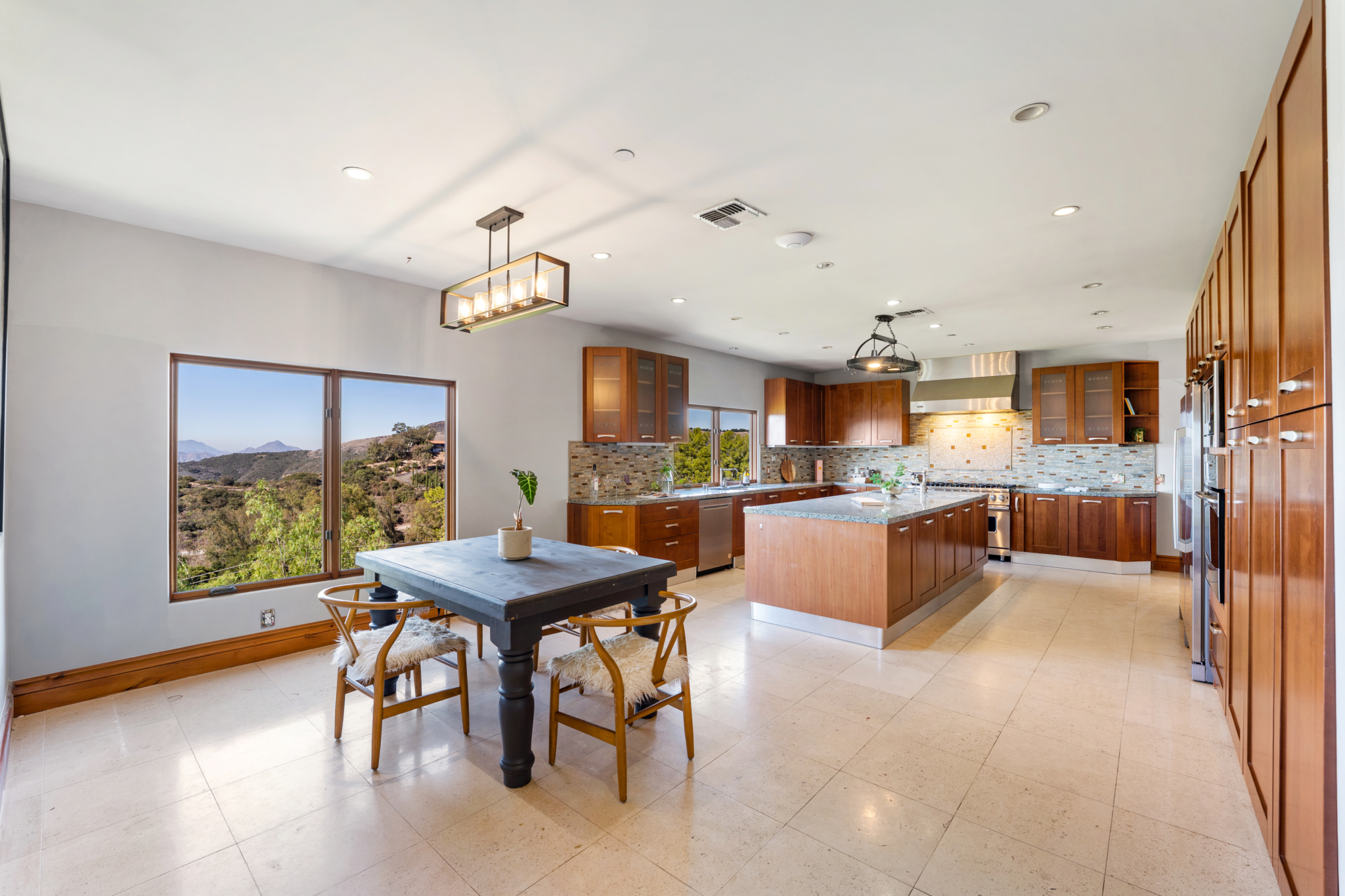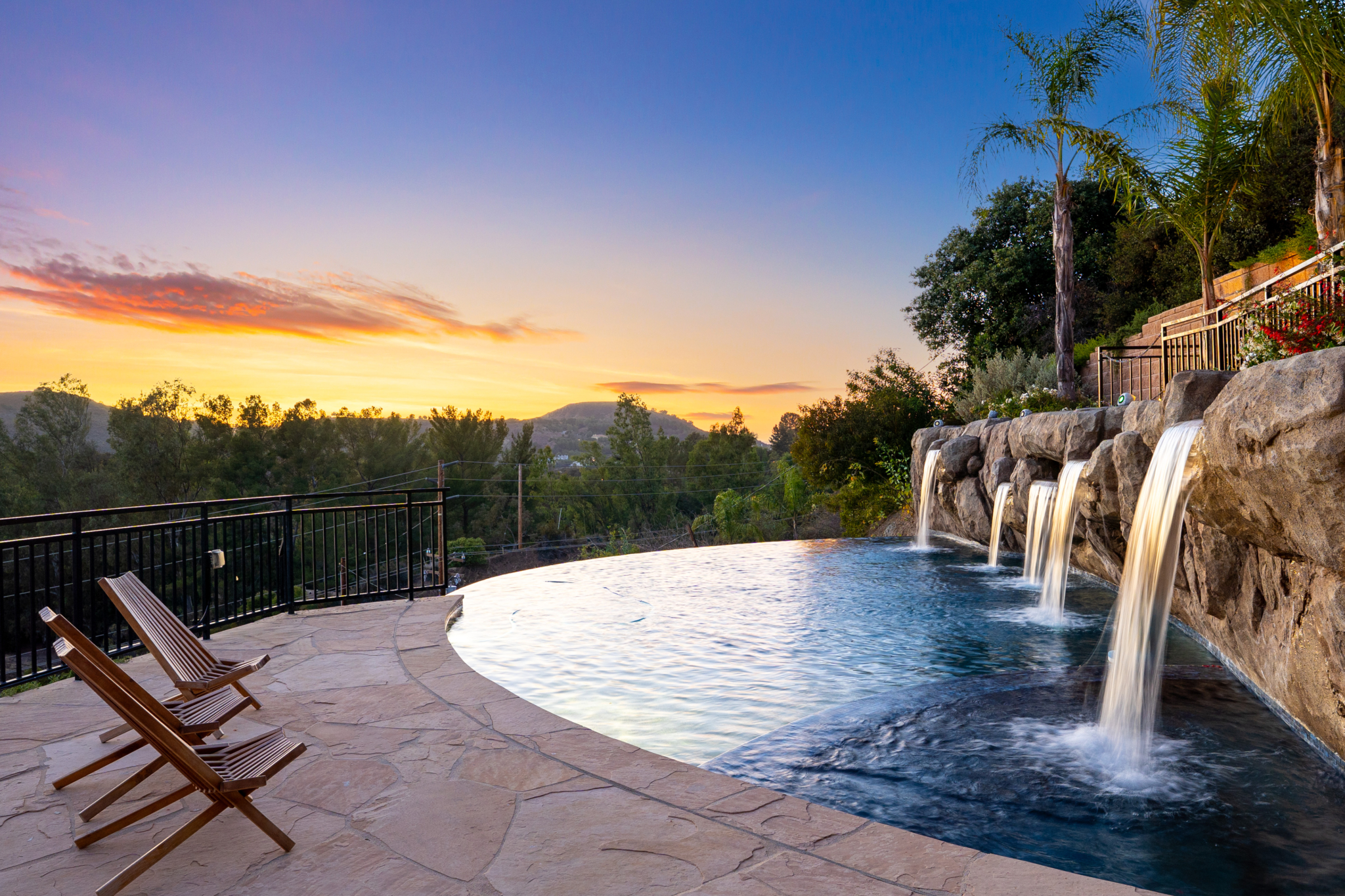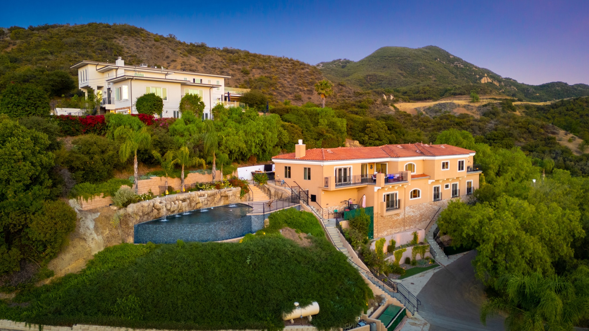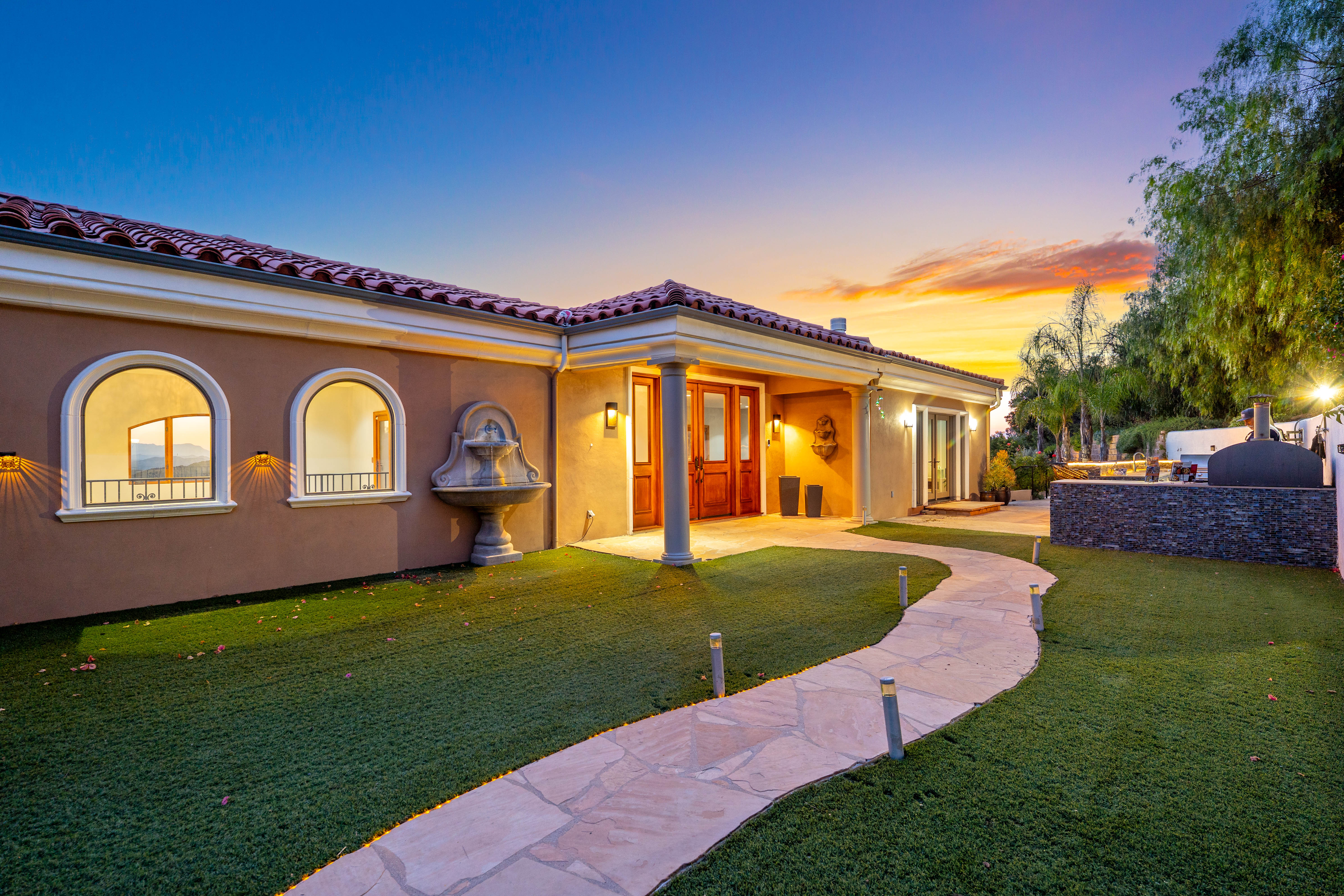 Tucked into the tranquil beauty of the Santa Monica Mountains, this estate is a rare find — blending architectural elegance with nature’s finest views. Perched just off the iconic Mulholland Highway and resting on nearly an acre of fully landscaped land, this 4,579 sq. ft. residence offers an unmatched lifestyle. Enjoy some of the most breathtaking views in the entire Santa Monica Mountain range, with sunsets off the patio that will truly take your breath away. Originally built in 2008, the home features a brand new negative-edge pool and spa oasis, complete with cascading waterfalls for a true resort-style experience. The outdoor space is an entertainer’s dream, boasting a fully equipped kitchen with a built-in pizza oven, high-end grill, and prep area — all set against a stunning mountain backdrop. Inside, the chef’s kitchen is outfitted with a Viking 8-burner stainless steel range and an oversized center island, perfect for hosting and everyday living. Throughout the home, you’ll find beautiful hardwood flooring, along with rich alder wood finishes including custom casement windows, French doors, interior doors, and baseboards. The main level offers light-filled living areas with a southwest-facing orientation, while four spacious bedrooms are located on the lower level. There is also ample room to further customize the home to your vision. Located just seconds from Viewpoint School and within the award-winning Las Virgenes Unified School District, this gated estate is ideally positioned just minutes from Malibu’s beaches and the Calabasas Commons—offering the perfect blend of natural serenity and everyday convenience.