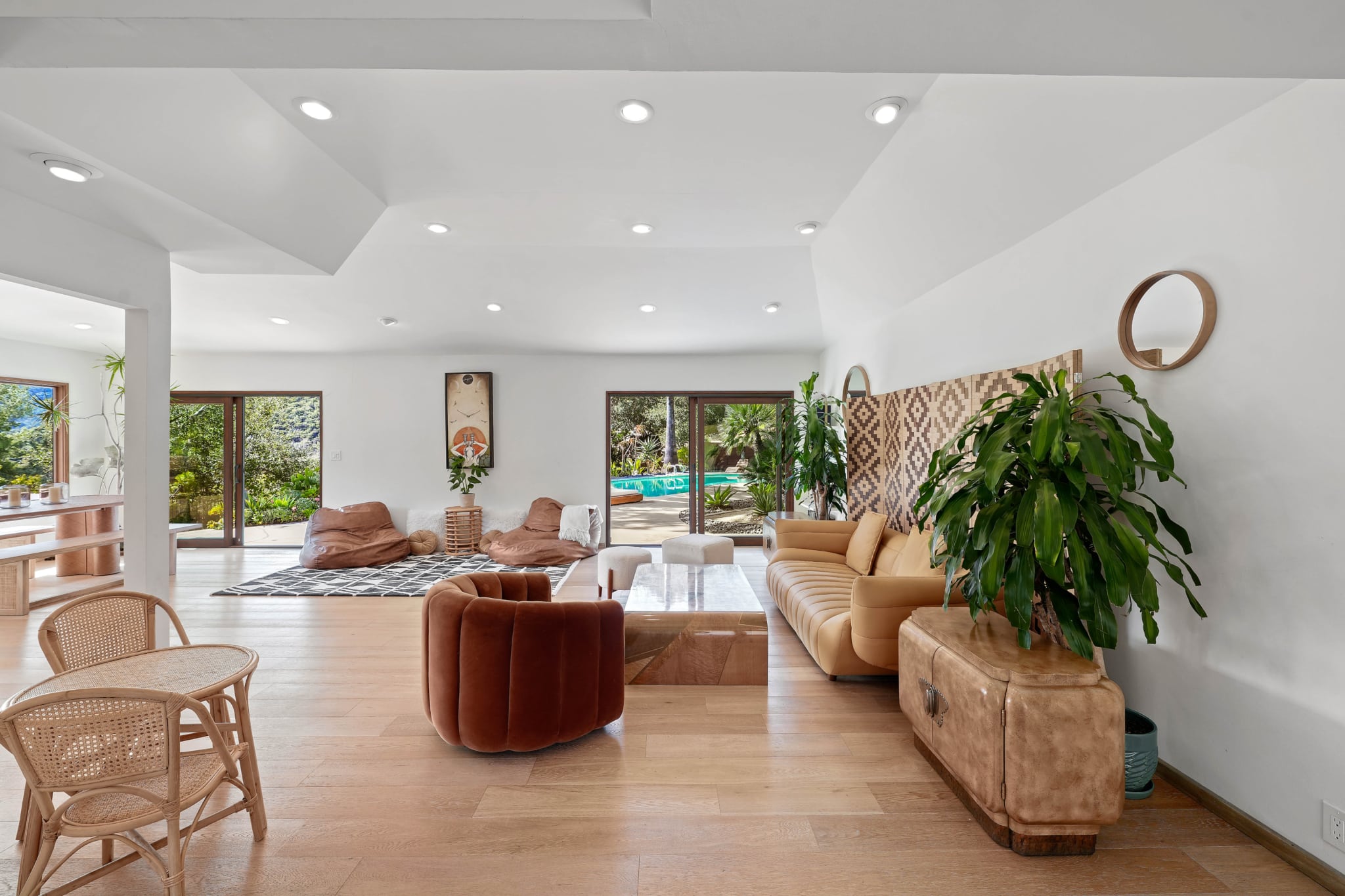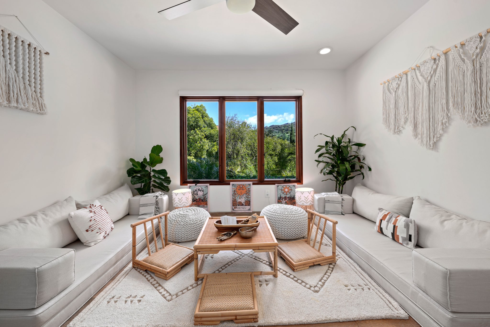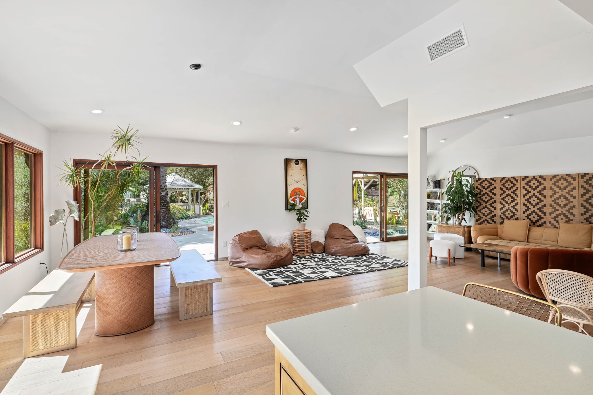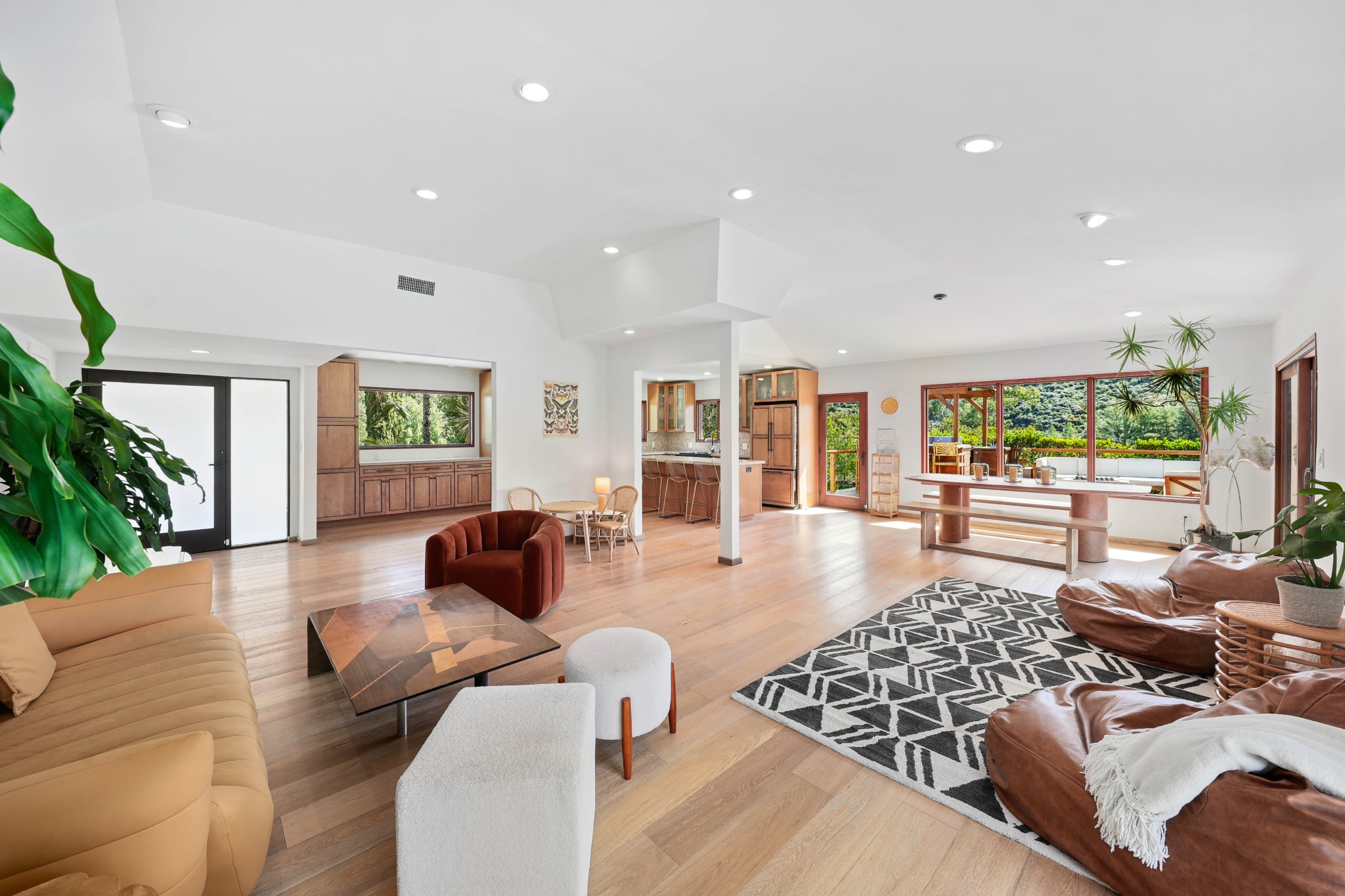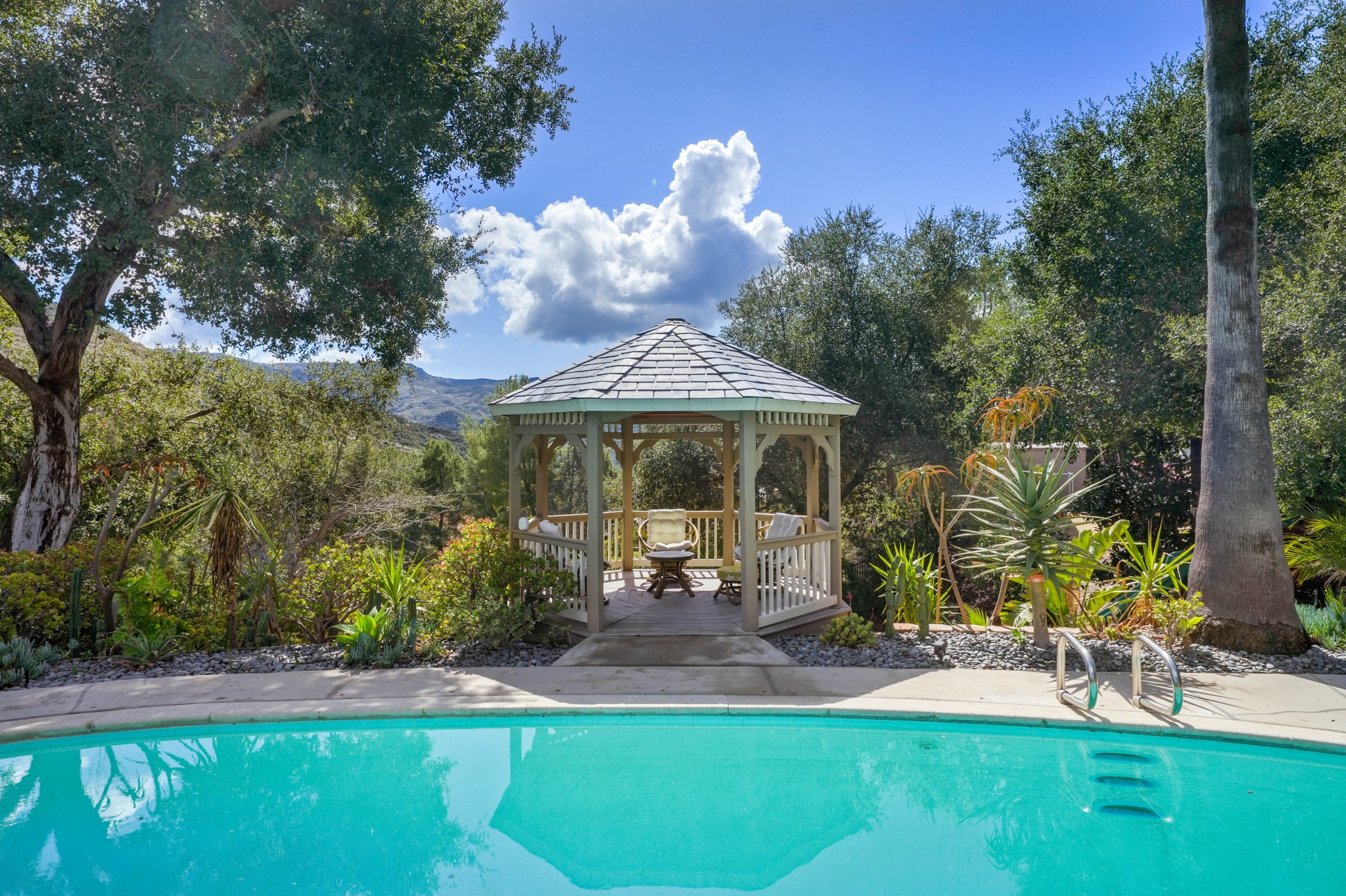 Discover a one of a kind creative sanctuary in the serene Calabasas Mountains offering a rare blend of privacy, versatility, and soulful living. This retreat features a beautifully updated four bedroom, three bath main residence complemented by a detached ADU perfect for guests, extended family, rental income, or a home studio. Inside, the open concept floor plan is filled with natural light and designed for seamless indoor outdoor living, creating an ideal environment for family gatherings, entertaining, or quiet relaxation. Step outside to enjoy a sparkling saltwater pool, cold plunge, and mineral rich swim spa, all surrounded by lush landscaping and mountain views. Over the past two years, the entire property has been thoughtfully transformed with thousands of plants into enchanting meditation gardens, meandering fruit tree paths, and a natural amphitheater designed for family events and community gatherings. Additional amenities include a detached ADU with a full kitchen offering flexible space for guests or income potential, a dedicated yoga studio for personal practice or private sessions, an inspiring art studio ideal for painting, sculpture, or creative workshops, and a professional recording studio with a sound booth designed for musicians and creators. These carefully curated spaces provide opportunities for wellness, artistic expression, and connection, making this home perfect for families seeking a lifestyle that supports creativity and everyday living. Whether you envision hosting gatherings, running wellness retreats, or simply enjoying a peaceful lifestyle with proximity to Malibu beaches and Los Angeles, this property offers a rare opportunity to live, create, and thrive in a setting that feels like a private retreat while staying connected to city conveniences.